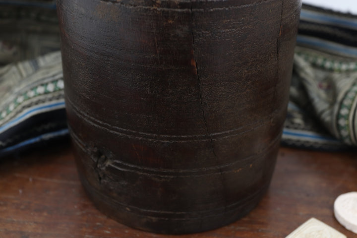 This beautiful wooden vase originated in the late 19th century in Nepal. It has been hand-carved out of a block of wood which highlights the quality of this pot. Each pot is uniquely handmade. The carvings of this particular pot add lovely circular patterns throughout. However, due to the age of this pot, there is a crack up one side.